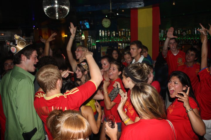 The party doesn’t end when the games does. The music cues up and “Stereo Love”, “I Gotta Feelin” and other pump you up songs drive our feet and a flash rave begins. Walking away from el Corte Ingles we chat along with the Spaniards and dance in the sidewalks. 30 minute pause to eat and then the festivities continue. All of us clad in our Spain colors fit in with the locals. We enter the Chuputeria and dance to Mambo #5, I Gotta Feelin, Be My Lover and La Vida Loca. Someone shouts “this is our last Friday in Salamanca, go all out!” as the climax of “If We Ever Meet Again”.