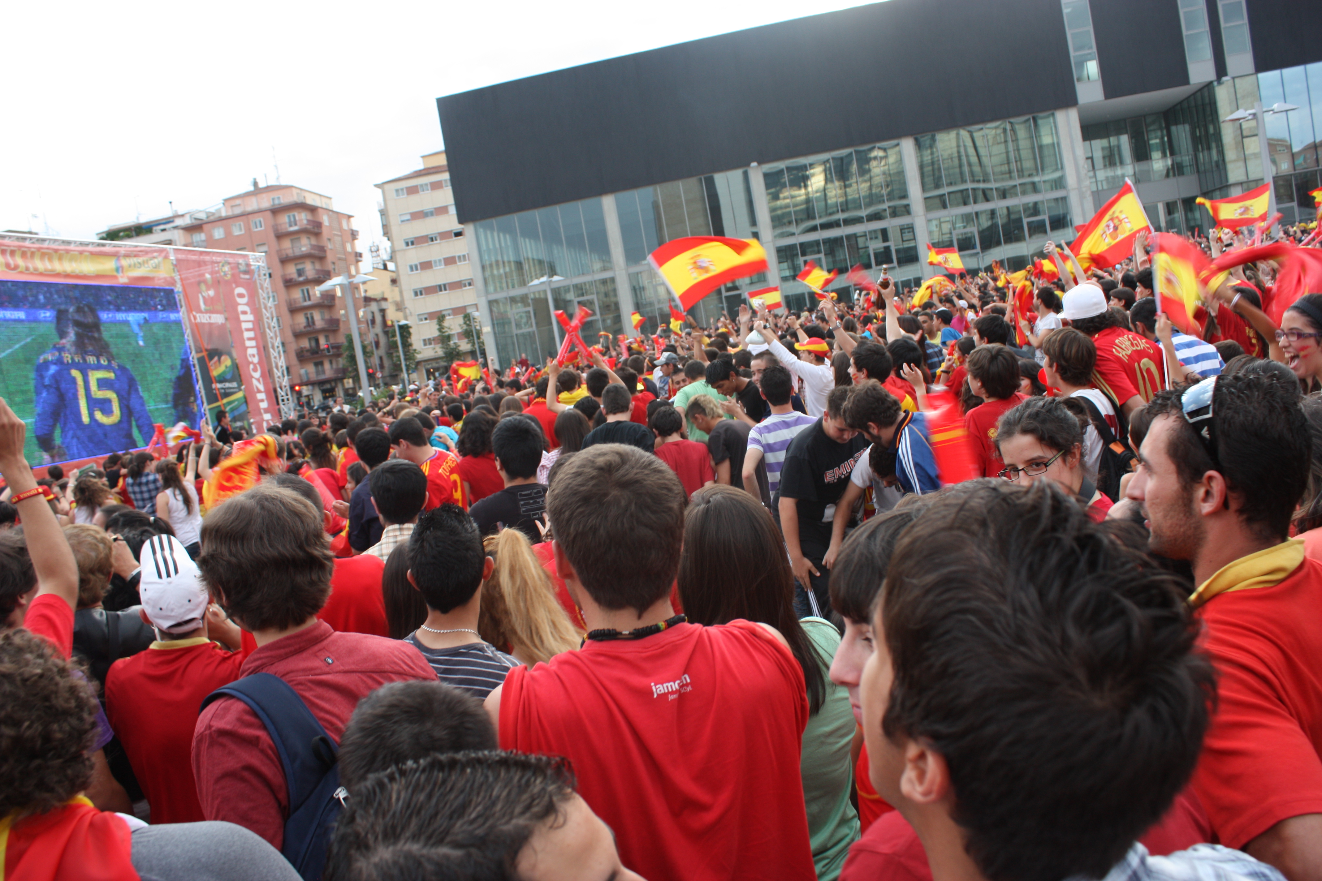 Chaos as always met us at el Corte Ingles. Drums bang, vuvuzela squeal and Spaniards scream “hijo de punta” meaning son of a bitch at the refs. Gamos and Villa score and we go crazy chanting “Amarillo y roja” Spain’s colors.