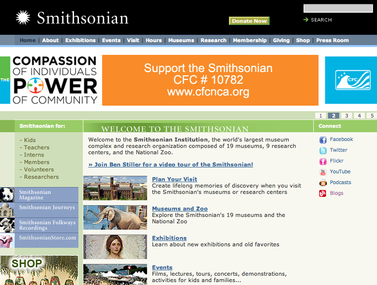 This Institution connects with its audience through its museums but also runs an extensive blog webpage supplementing educational mission. On the home page of the Smithsonian website there is a”connect” bar on the right side linking to their Facebook, Twiter, Flickr, Youtube, Podcasts and Blogs.