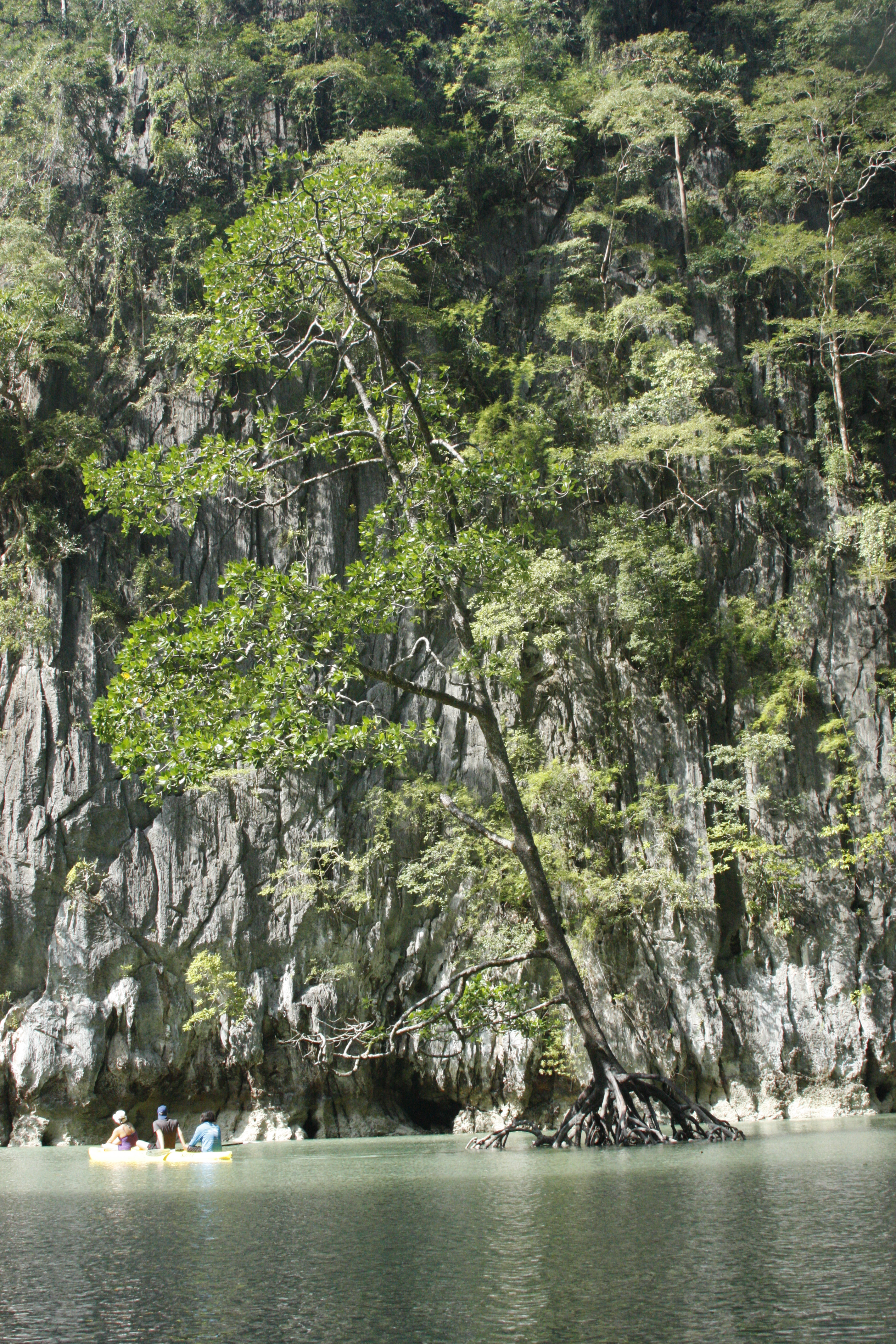 When we sit back up we are inside a lagoon. 1,500 feet in the air the mountains surround us with trees peaking out fighting for sunlight. It is completely quiet except for the sound of paddles. Mangrove trees are in the shallow part of the lagoons. They only release their seeds during low tide so they will float to another part of the lagoon or outside. Otherwise they would take root by the tree and be competition for sunlight. Yeah trees are smart in Thailand.