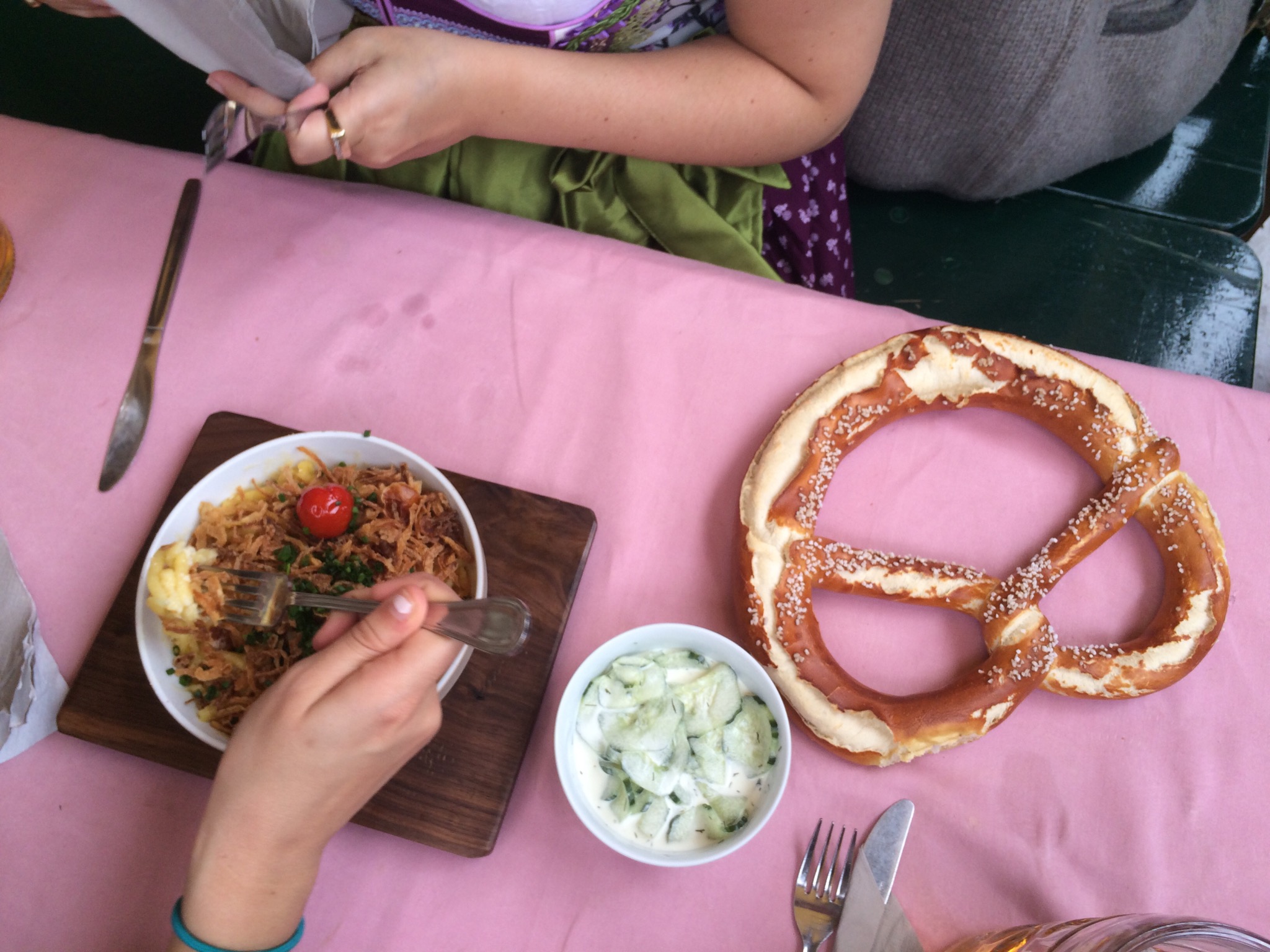 We sneak our way in, 3 girls in dirndls are hard to deny, and walk around this open space. It is exactly as one would picture a German beer garden. As we walk in a big party leaves and we grab the table. Our waitress arrives and asks what we want in German. All the menus are in German and my Spanish minor is no help here. She struggles through some English translations which we are thankful for. We order 3 steins, a huge pretzel and a kasespatzle. Kasespatzle is basically mac and cheese with crispies on top. It came with a cucumber dill salad.