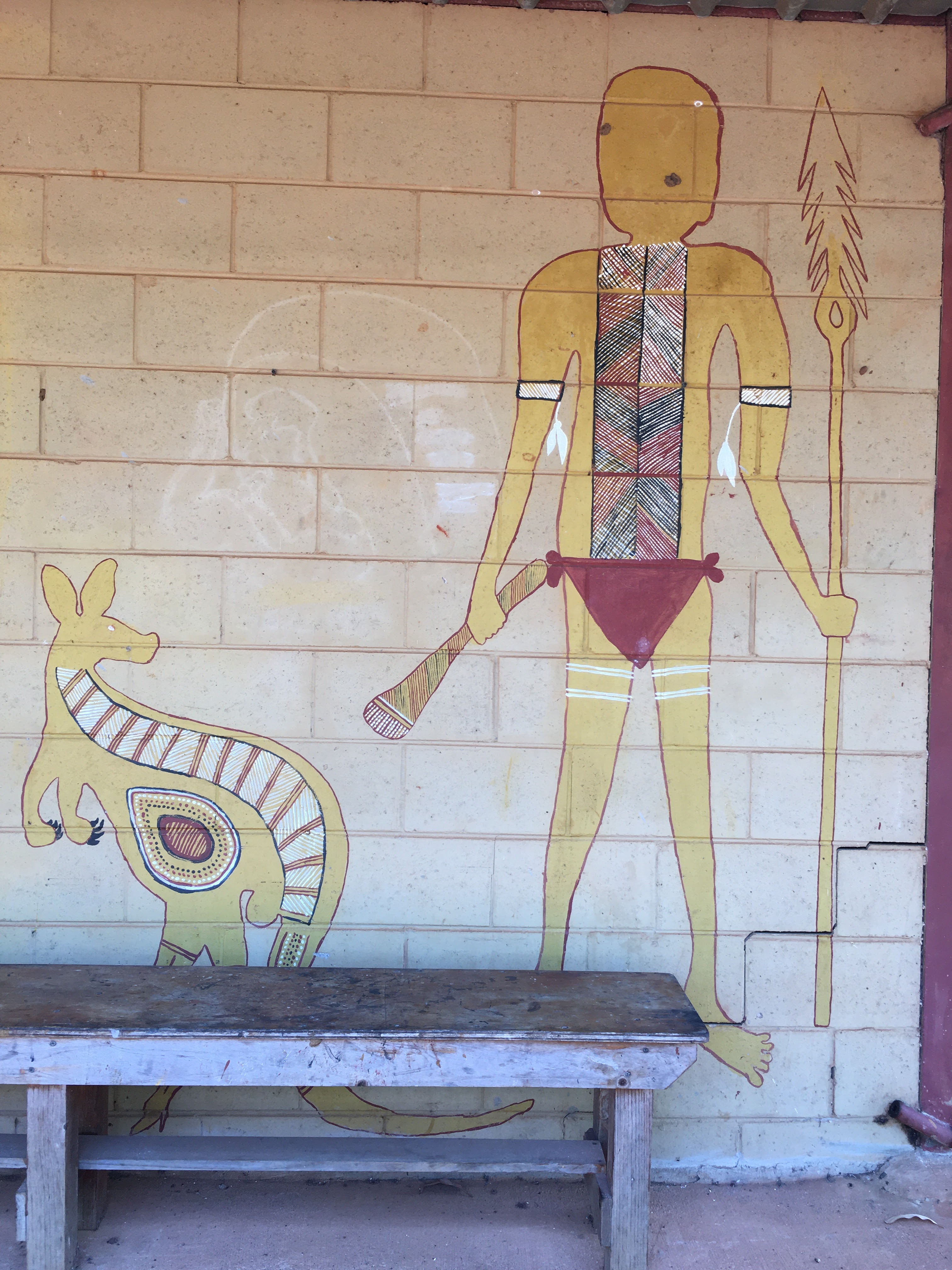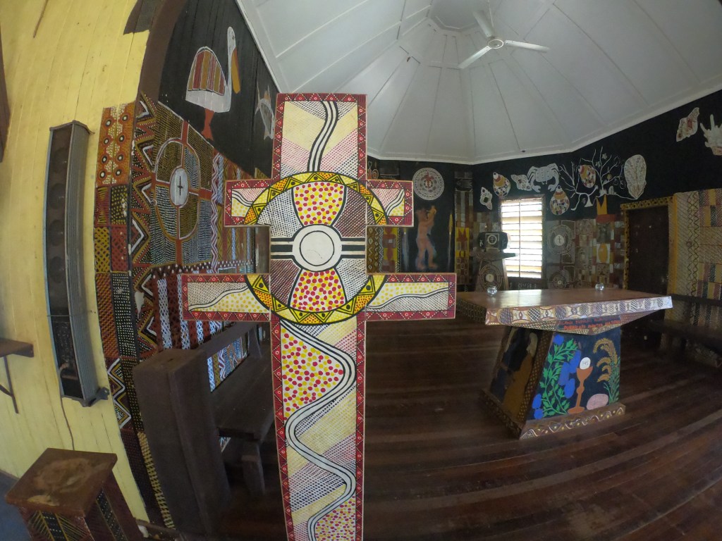 The plain white building lifted 30 ft into the air to protect from the monsoon season looks like nothing to note on the outside. Entering the doors the wooden pews lead you to the front. The alter is what causes you to stop and stare. The alter has been detailed in dot paintings. Animals, people, landscapes, all are painted on a solid black background. It is a beautiful example of the Aboriginal local culture meeting and trying to join the entering forces.