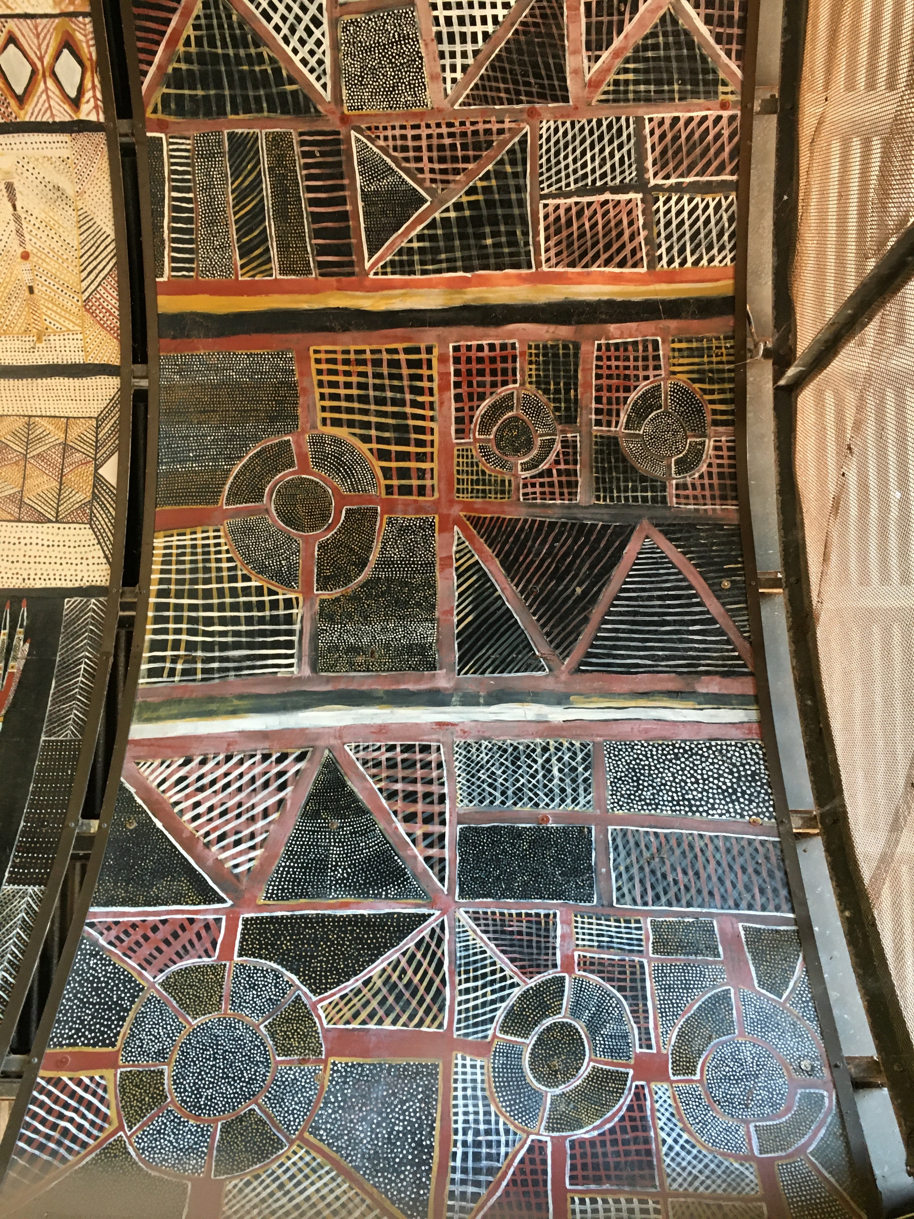 Our tour guide gathers the 20 or so of us up. Him and his wife run the business and employ local Aboriginals as tour guides, story tellers, historians, and artists. Our first stop is to a not for profit, as the Aussies say, that works with disabled people through art. Ngaruwanjirri operates in Tiwi and promotes local art. The women working there explain who their artists are and how they create the paint onsite from local ingredients. All the artwork on the domed ceiling has been done by their artists. It is incredible.