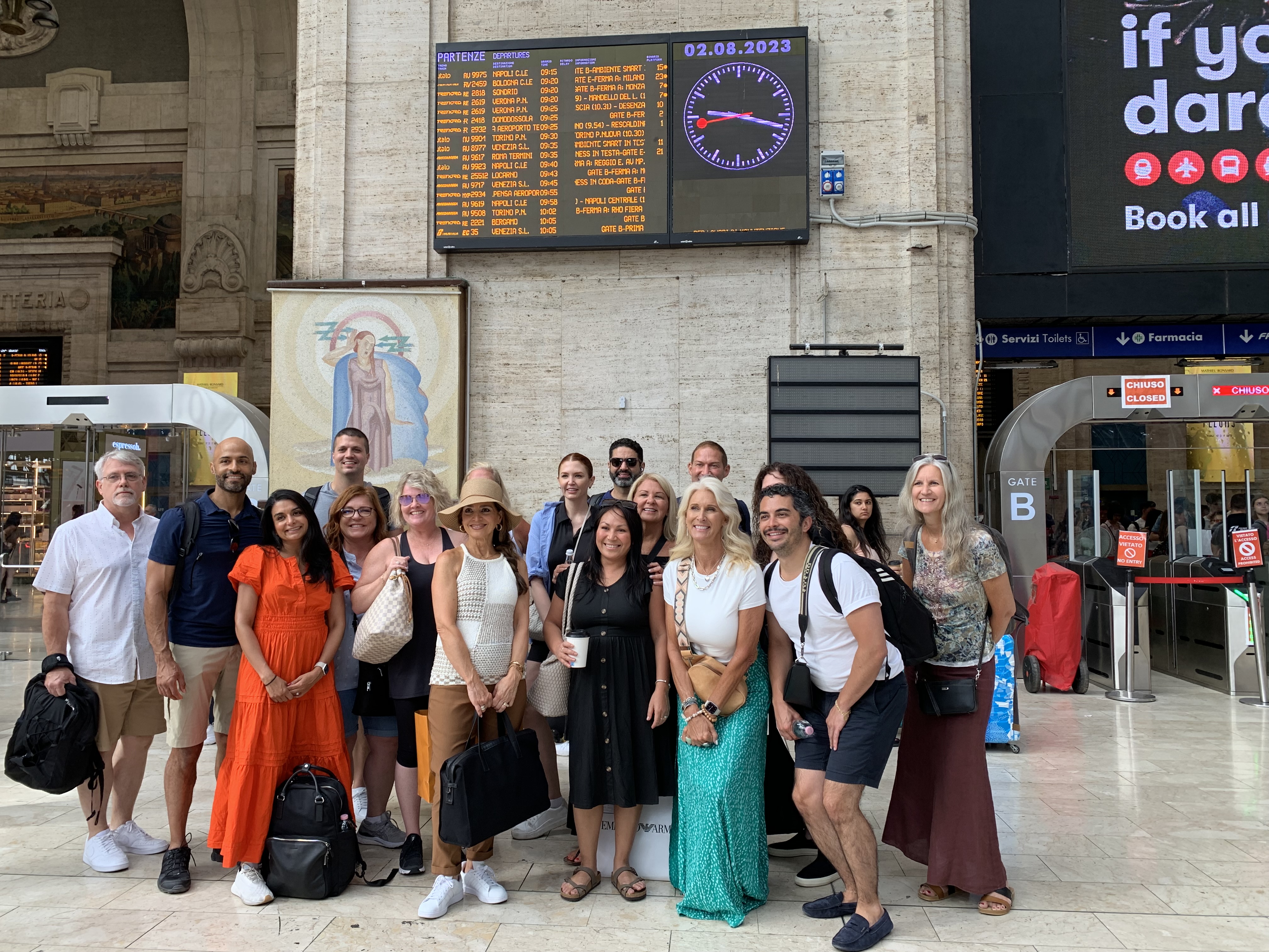 To get from Milan to Venice we hired a private train car. I didn’t even know you could do that! So much better than flying as you can really enjoy the Italian country side. Plus the train rolls right into Venice exiting into the city itself surrounded by water. We had a private bus pick us up and manage our luggage. Door to door service is the lux way! From the private bus we walked through the gorgeous but notorious train station. Everyone sat down, enjoyed each others company, and watched the Italian landscape roll by. A little time later a plate was delivered with a small breakfast and Prosecco. Everyone was exclaiming, first how much we were eating, and second, how incredible this has been! I sat there smiling, sipping my Prosecco with my manager enjoying their delight.