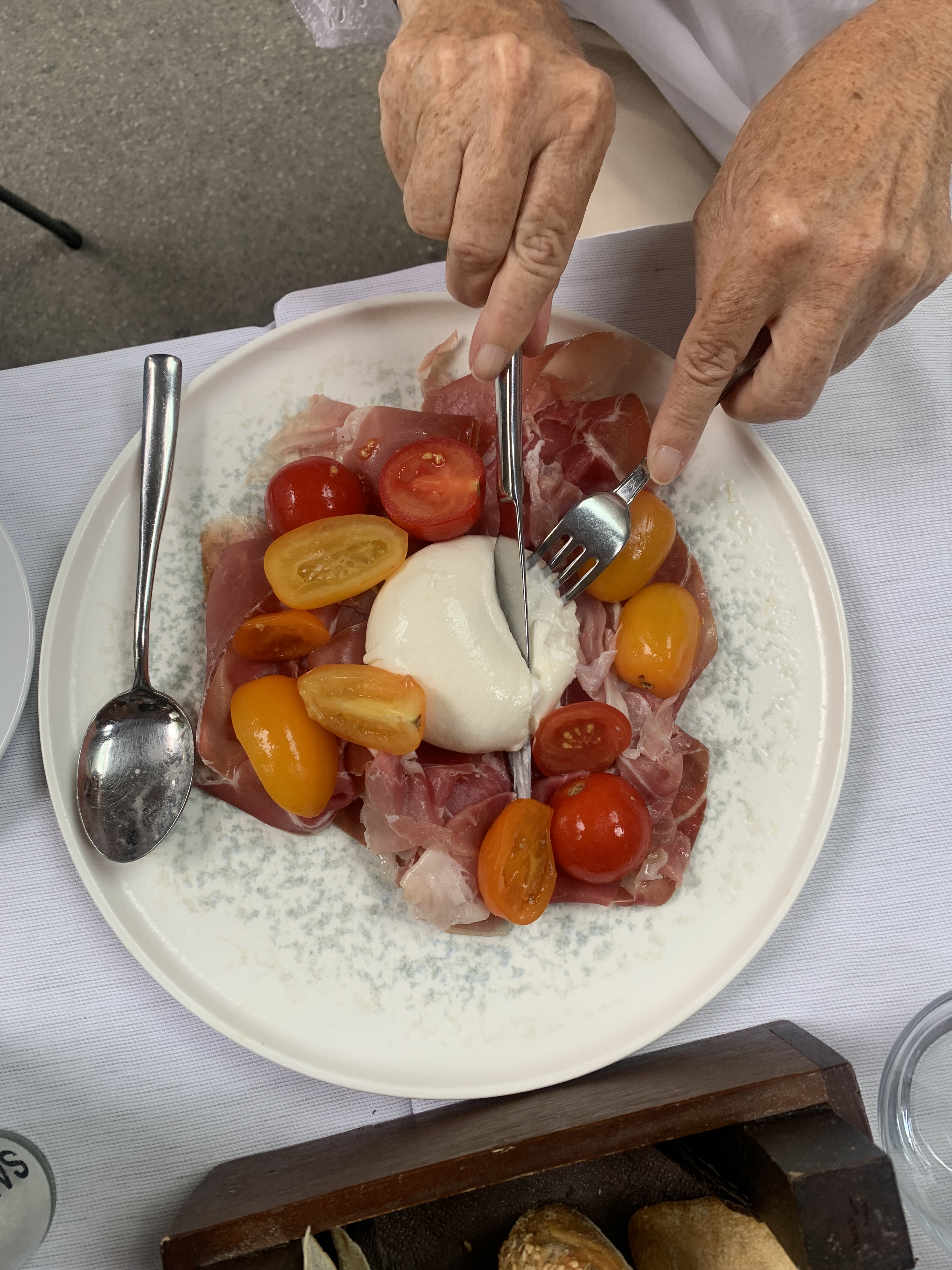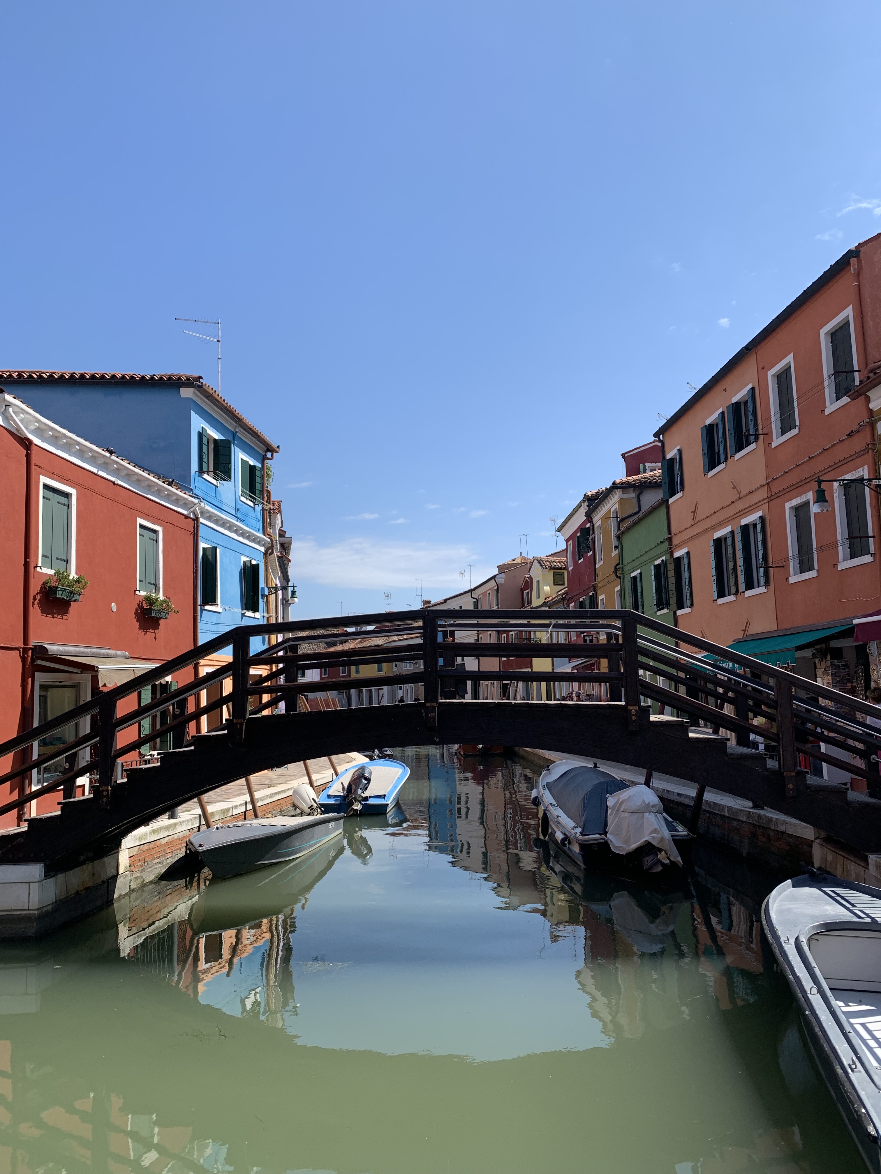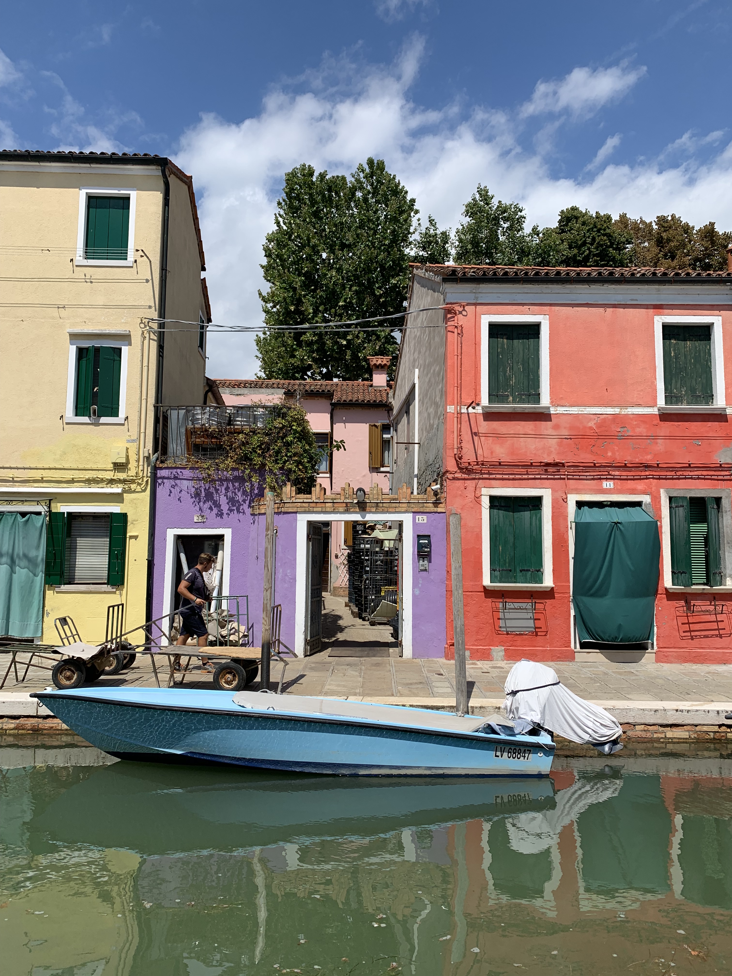 Torcello is our final destination and a relief to be back on the water to escape the heat. In this ivy covered grotto we sit down to a large table for lunch. There is a garden behind and a fan blowing the hot air around. A variety of fish dishes greet us one after another. We all leave incredibly full and ready for a nap. The breeze of the speed boat on the way back is a welcome wake up call.