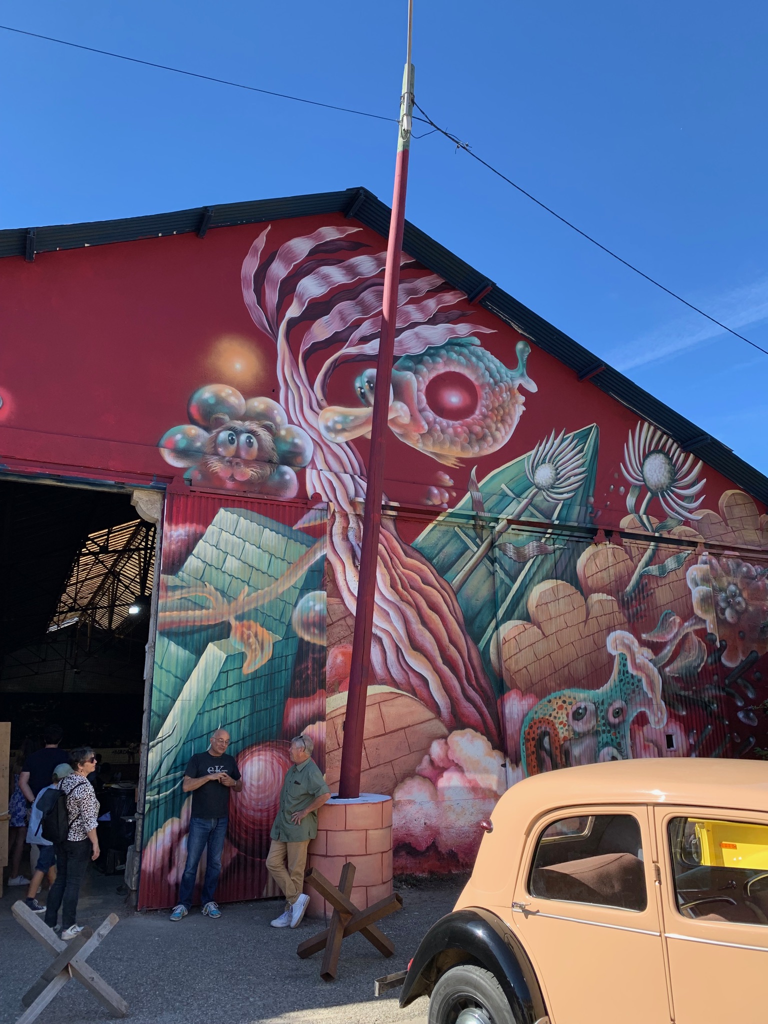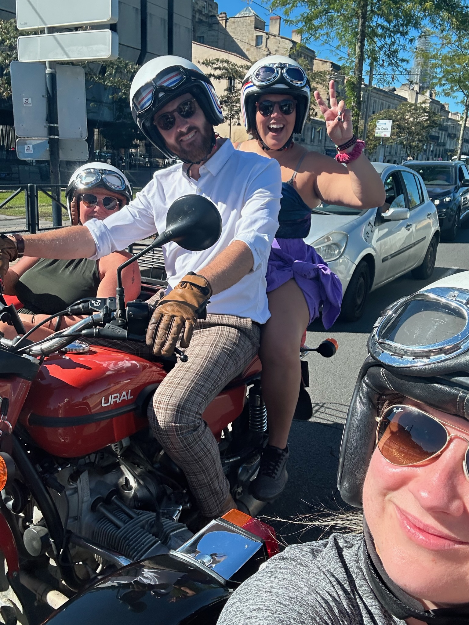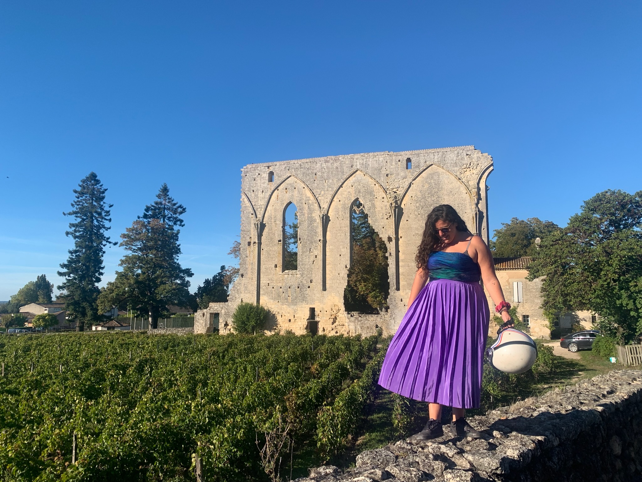In the morning, we wandered along the river Garonne and enjoyed the art and vintage shops in Fabrique Pola. After some jet lag miscommunication we were locked out of our airbnb. Thankfully I thrifted a skirt and scarf that I made into a top. We ate a crepe on the street and then hopped onto the motorcycles with our cute guides. They whisked us from the highway to the back roads lined with rows and rows of grapes sitting in the hills enjoying the late fall sun.